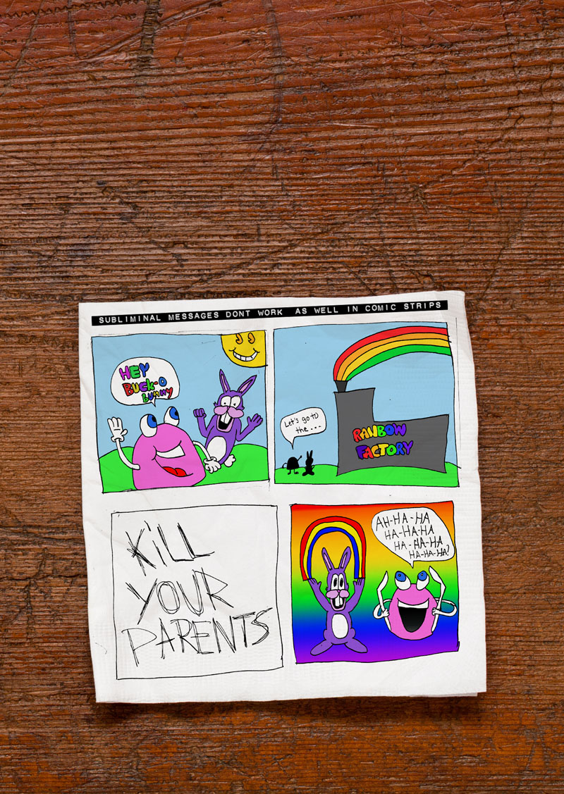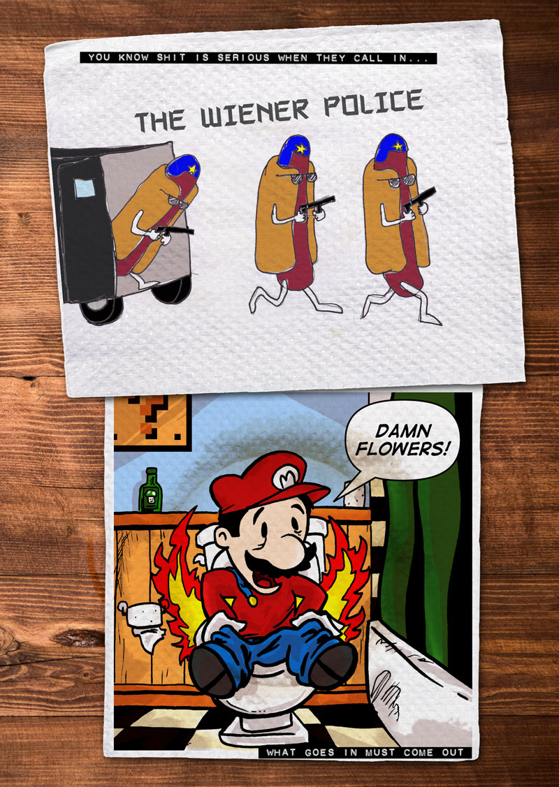 A drunken sketch is a terrible thing to waste. That’s why we followed the Drunken Cat around as he went barhopping across the country. Give him a few shots, hand him a crayon and a stack of bar napkins and you never know what you’ll get. We’ve put together this collection of what we thought were some of his better (read: more legible) sketches. The comics inside range from the absurd to the self reflective, depending on what he was drinking, with plenty of pop culture references thrown in for good measure. He was drunk when he made them but you don’t have to be drunk to enjoy them… but, of course, it doesn’t hurt!