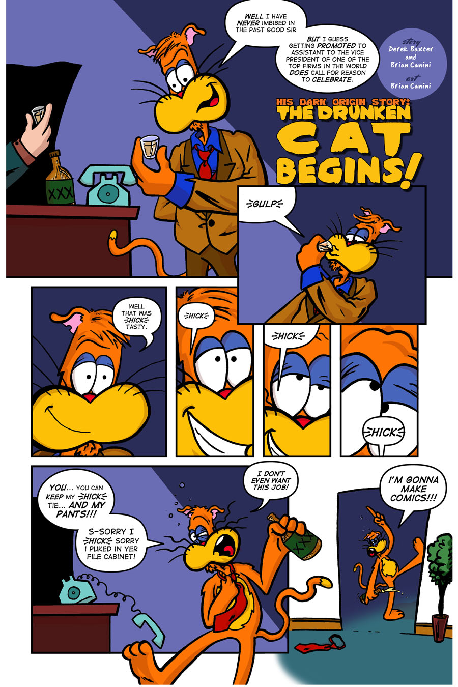 Every legend has a beginning. In this book you will see the evolution of Drunken Cat Comics weekly strip, the Mixed Drink. Included in this book is the epic three-part origin story of everyone’s favorite inebriated orange feline, the Drunken Cat. You’ll also see the historic first appearance of now iconic staples of the Drunken Cat stable, including Marty the Maggot, Big Puff and Junkie Jake! But that’s not all! You’ll also find out where babies come from and why velociraptors make terrible babysitters! And as if that wasn’t enough, we’ve included a rarely seen story from the vaults entitled “Because of Air”. We even go all the way back to the very early days before Drunken Cat Comics was even a thought, with the first issue of “Bugman”. So what are you waiting for? Grab a bottle and start reading!