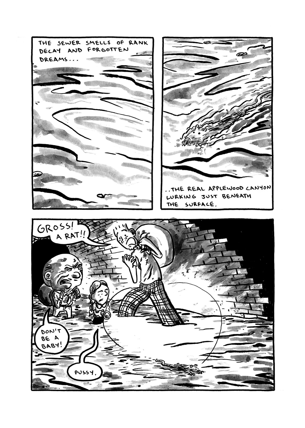 “Applewood Canyon is a masterclass in comic narrative structure and lyrical storytelling that peeks under the veneer of American exceptionalism and modern society. Evoking both the feeling of David Lynch's seamy underbelly vision in Blue Velvet and the commentary and wit of Dan Clowes' Ice Haven. Brian's beautiful, voyeuristic point-of-view drawings of 21st Century Americana coupled with his hilarious use of narration is completely mesmerizing. With all the twists and turns of a Twilight Zone episode gone completely haywire, Applewood Canyon is executed with surgical precision by one of today's hardest-working and talented cartoonists.” – S.R. Arnold